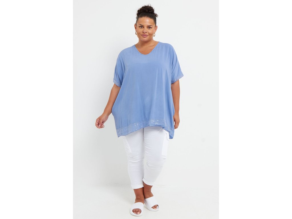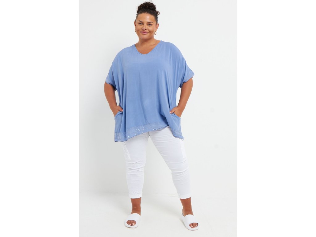 Volný top zdobený flitry s kapsami - barva světle modrá